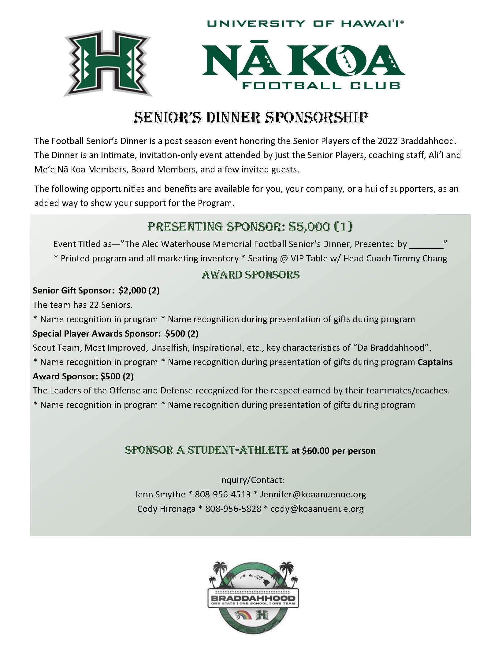 This year, more than ever, we would like to say “ALOHA and MAHALO” to our seniors and honor their leadership as they represented the University and State on and off the field. The seniors will be receiving a special commemorative gift from the Nā Koa Football Club and the Program will also recognize special outstanding individuals for their efforts on and off the field.