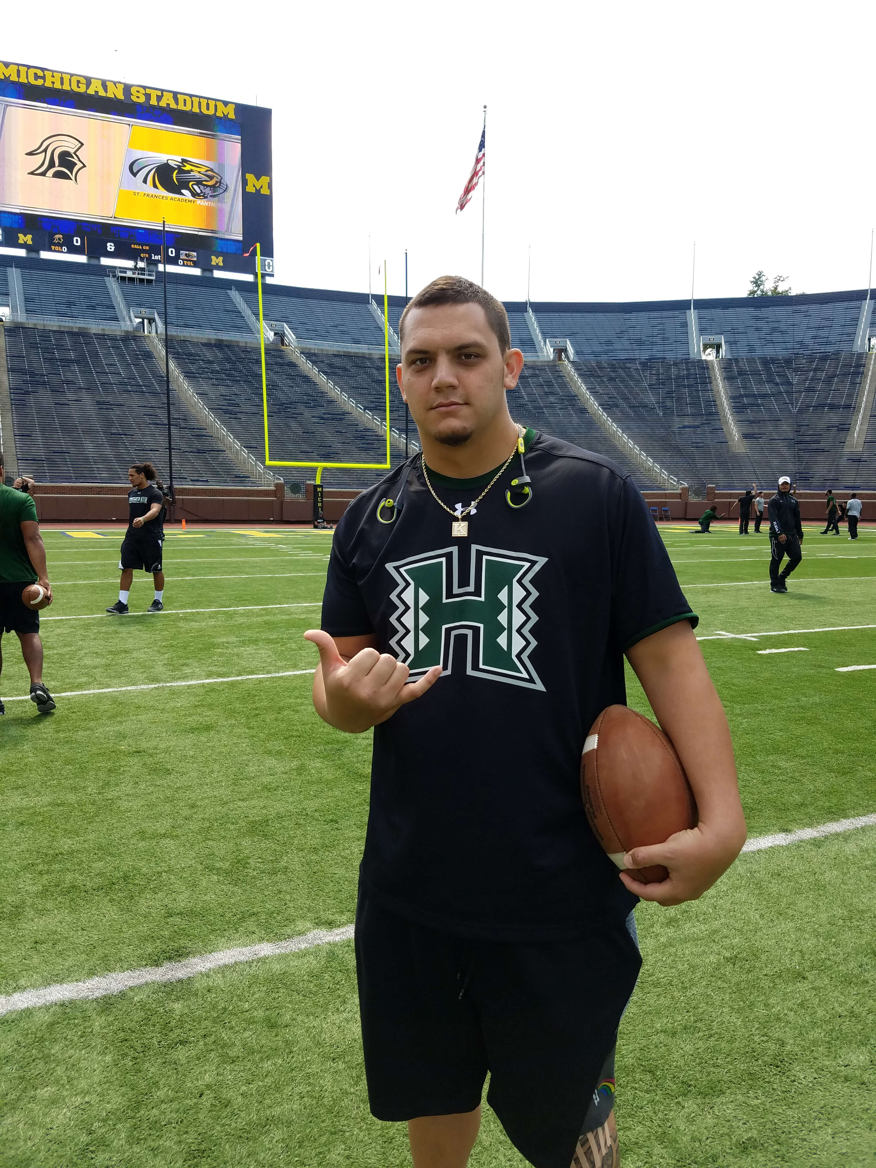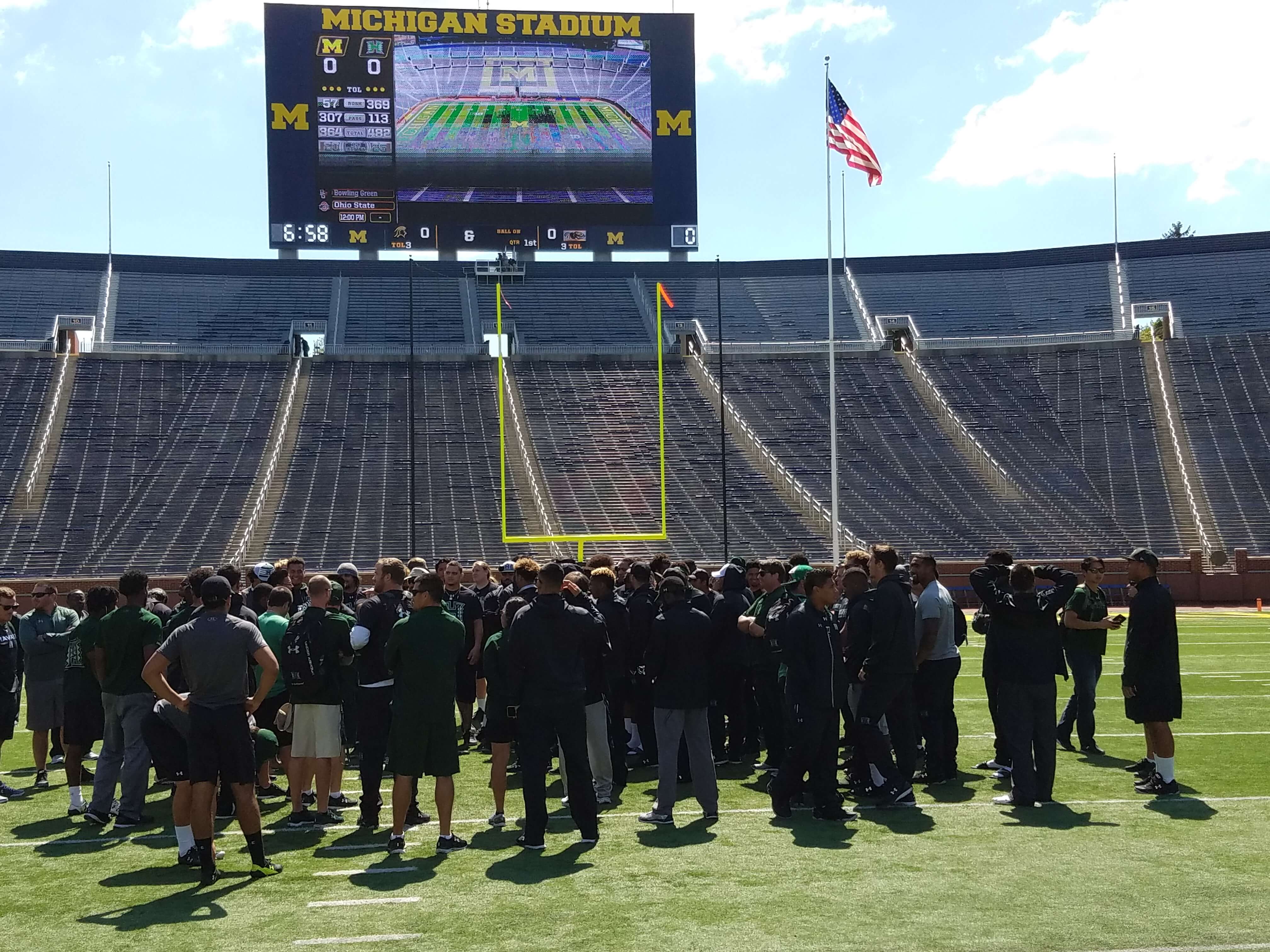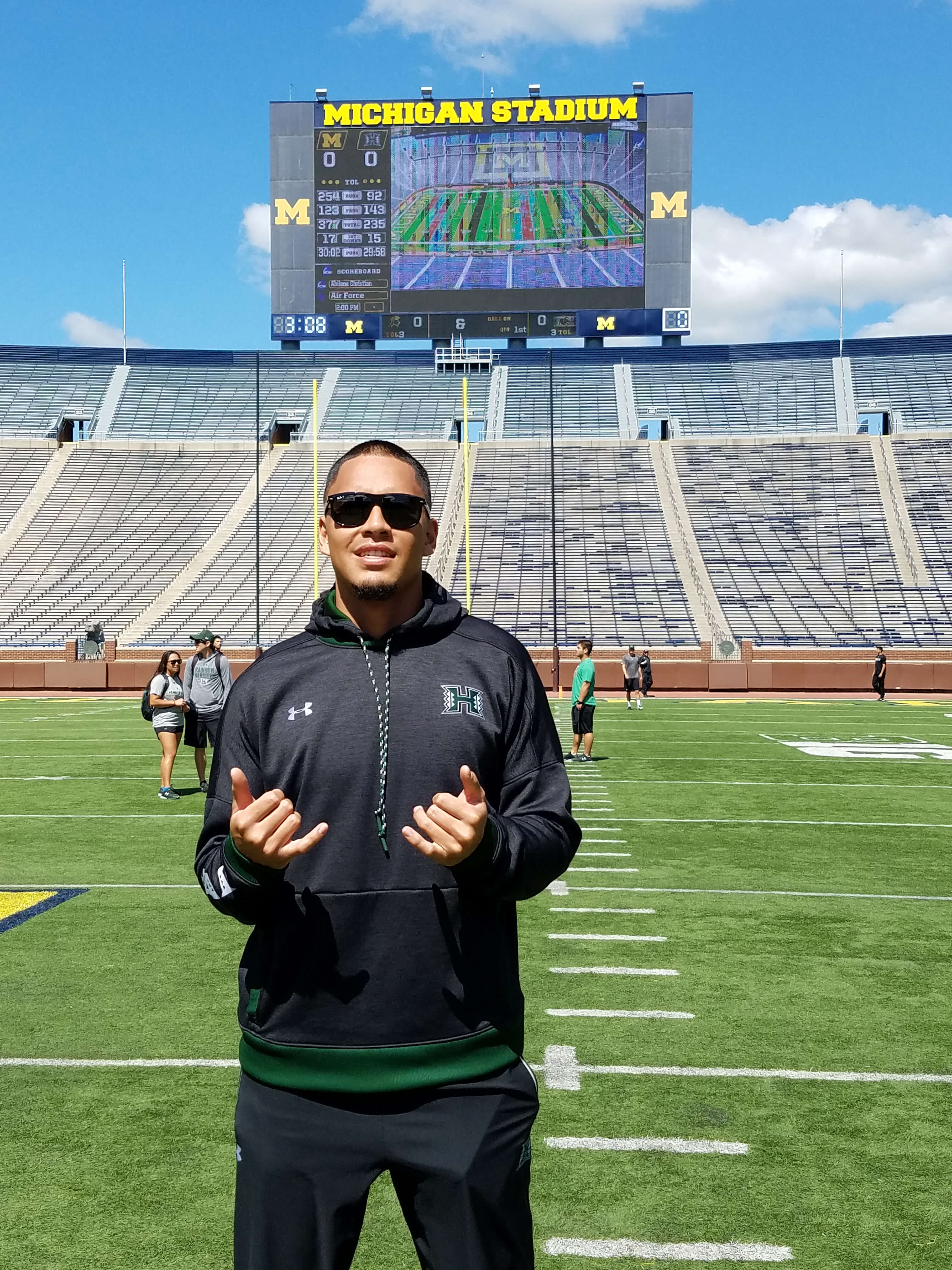 The Rainbow Warriors appreciated the University of Michigan’s traditions and amazing stadium, “The Big House.” The charter flight and great service provided by Hawaiian Airlines made the mainland trek easier, despite the final score: Michigan 63 – Hawai‘i 3. The Warriors are returning home for a Sept. 11 game against University of Tennessee Martin. Special thanks go to Eric Fujimoto (Nā Koa president) for these photos. For game photos, please go to the University of Hawai‘i Athletics website, https://hawaiiathletics.com/galleries/?gallery=694.